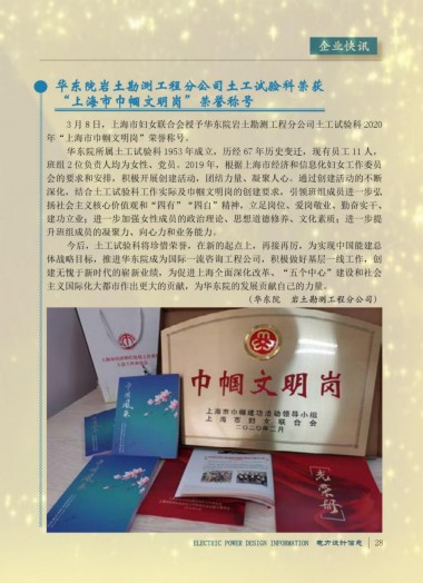 东北院煤中取水高效褐煤发电技术电厂实时水耗研究荣获二等奖。 3 月 8 日,上海市妇女联合会授予华东院岩土勘测工程分公司土工试验科 2020