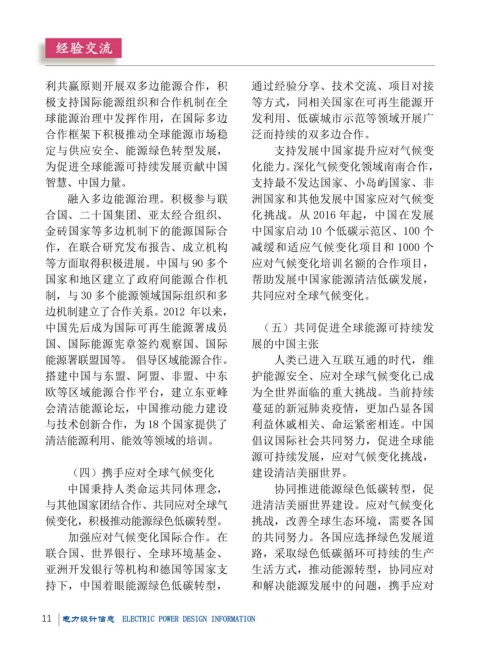 为促进全球能源可持续发展贡献中国 化能力。深化气候变化领域南南合作, 平衡、共赢的多边国际能源合作格局。 协同促进欠发达地区能源可及性,