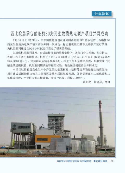 3 月 16 日 21 时 38 分,由中国能建规划设计集团西北院 EPC 总承包的山西临猗 30