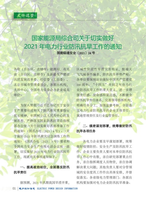 据预测,2021 年汛期我国旱涝并重, 机构要加强对电力企业防汛抗旱准备、 工况;要加强基建安全管控,排查治理 期灾害风险形势和本单位工作实际,精