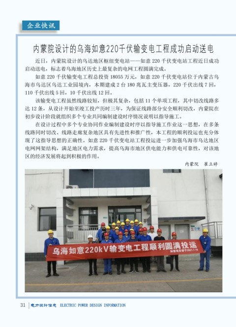 近日,内蒙院设计的乌达地区枢纽变电站——如意 220 千伏变电站工程近日成功 近日,内蒙院与信息产业电子第十一设计研究院科技工程股份有限公司联合体,