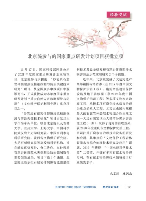 重要创新成果。项目下设 4 个课题,北 专利,在石窟水害治理技术领域处于行