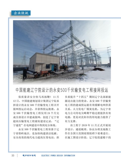 12 日,中国能建规划设计集团辽宁院承 源送出能力的使命。永安 500 千伏输变