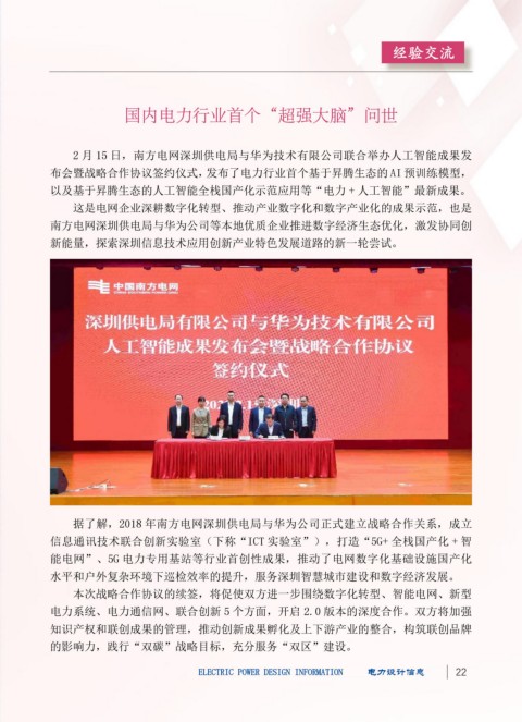 2021 年,中国电力规划设计协会在国家能源局的指导下,全面落实国家社会信 2 月 15 日,南方电网深圳供电局与华为技术有限公司联合举办人工智能成果发