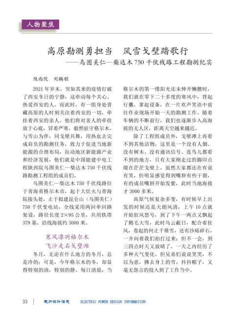 乌图美仁—柴达木 750 千伏线路位 有的成员嘴唇开始发紫,此时当地海拔 造成危险。为了确保安全,大家只能选 层也往往随之变化,为确保对地层的准