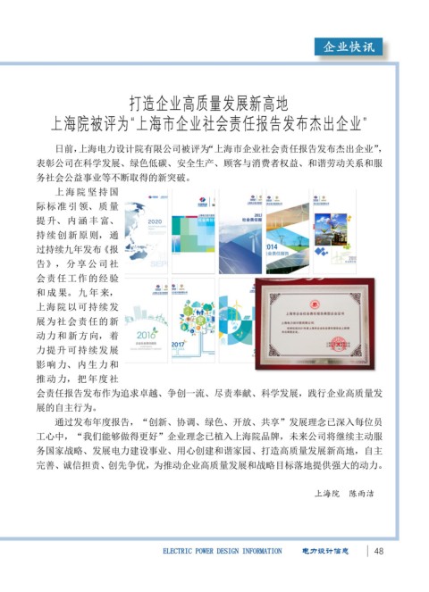 日前,上海电力设计院有限公司被评为“上海市企业社会责任报告发布杰出企业”,