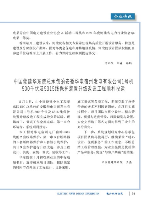 电可靠性和电能质量,满足保障首都供 变电站导体规格选型的精准率》《提高 知书后,旋即成立项目团队,按照预定 中国能建华东院 王盛