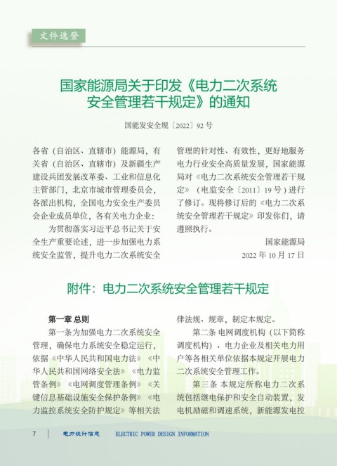 国能发安全规〔2022〕92 号 称二次系统);涉网二次系统是指电 律法规和国家能源局监管要求组织