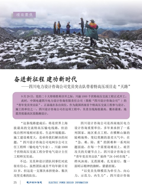 ——四川电力设计咨询公司党员突击队带着特高压项目走“天路” 伏特高压交流输电线路 2 条,±1100 千 特高压交流骨干网架的起步工程,也是