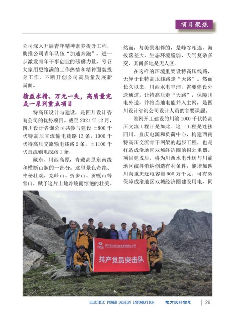 ——四川电力设计咨询公司党员突击队带着特高压项目走“天路” 伏特高压交流输电线路 2 条,±1100 千 特高压交流骨干网架的起步工程,也是
