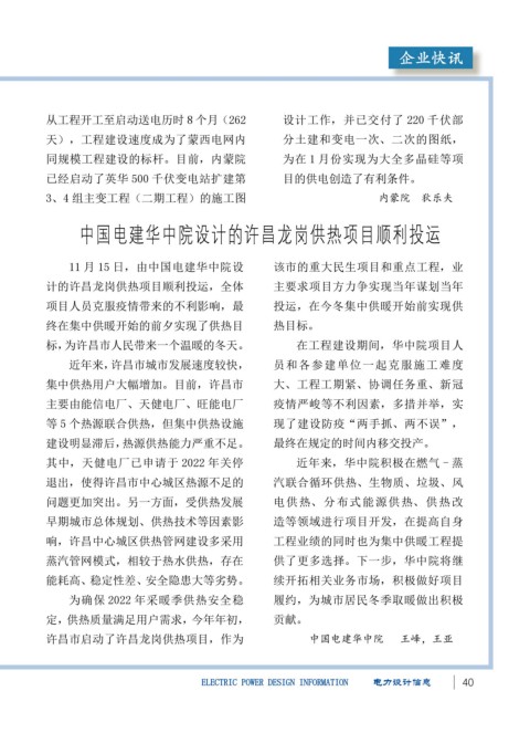 中调主变、220 千伏母线、66 千伏母线 投产送电,11 月底前整体工程投产送 中国电建华中院设计的许昌龙岗供热项目顺利投运