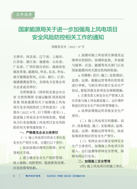 项目安全风险防控工作的意见》(安 (八)海上风电项目的参建单位, 加强与政府相关部门的衔接,按照政