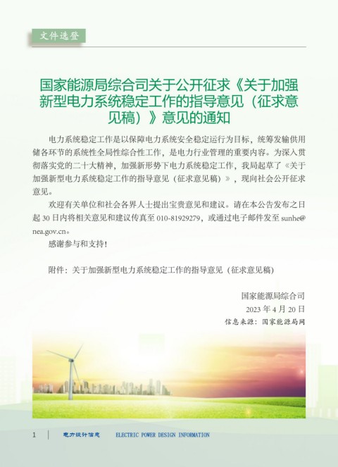 加强新型电力系统稳定工作的指导意见(征求意见稿)》,现向社会公开征求