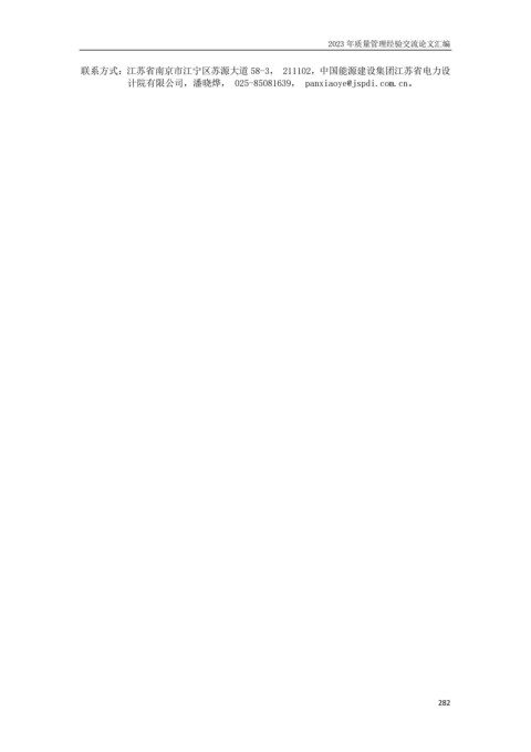 2023 年质量管理经验交流论文汇编 联系方式:江苏省南京市江宁区苏源大道 58-3, 211102,中国能源建设集团江苏省电力设 计院有限公司,潘晓烨, 025-85081639, panxiaoye@jspdi.com.cn。 282
