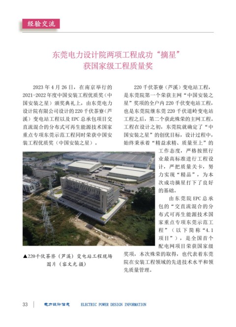 国安装之星)颁奖典礼上,由东莞电力 星”奖项的全户内 220 千伏变电站工程, 国电机工程学会鉴定为国际领先水平。在推动新型电力系统构建、服务“碳达峰、
