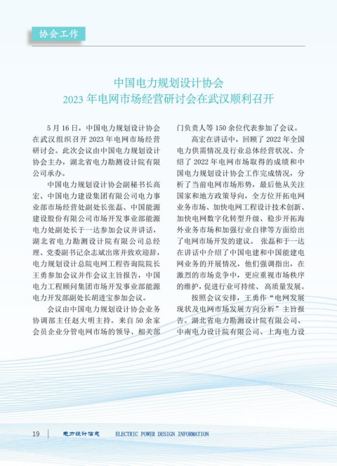 在武汉组织召开 2023 年电网市场经营 高宏在讲话中,回顾了 2022 年全国 电网市场环境、 电网新技术、电网业 会议主旨报告和各单位的交流发言内容