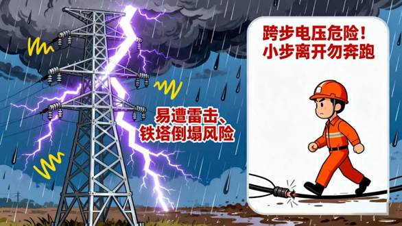 如果遇到这种情况,正确的做法是:小步移动(减少跨步电压差),尽快离开危险区域,而不是大步奔跑。