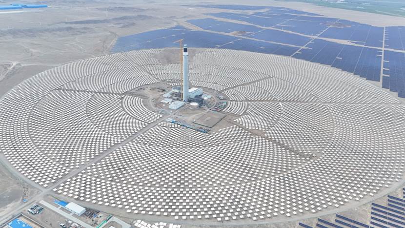 博州项目创新采用“光热储能+”开发思路,有效解决新能源发电的间歇性问题,对构建新型电力系统具有示范意义。2024年10月,高达220米的吸热塔成功封顶;2025年1月,项目首批光伏并网发电。建设期间,成都院团队顶住工期压力,挑战极寒天气,确保了工程关键节点的顺利实现。